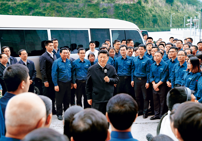 2018年4月26日下午,中共中央總書記、國家主席、中央軍委主席習近平在武漢主持召開深入推動長江經濟帶發展座談會并發表重要講話。這是座談會前,習近平于24日下午在三峽大壩左岸電站考察。 新華社記者 謝環馳/攝