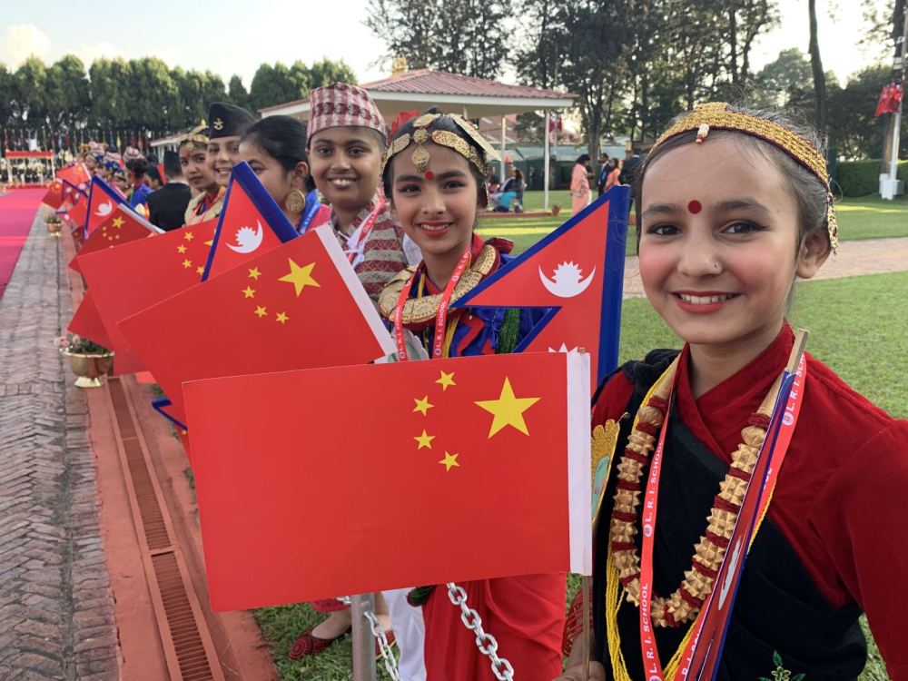 2019年10月12日,尼泊爾首都加德滿都特里布萬國際機場,尼泊爾孩子們站在紅地毯一側(cè),熱烈歡迎中國國家主席習近平來訪。新華社記者高潔攝