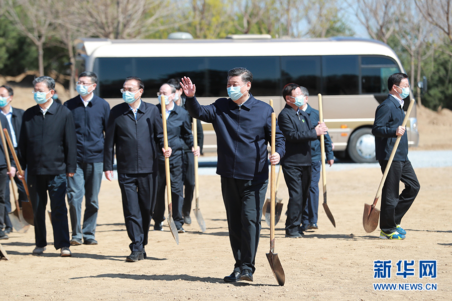 4月3日,黨和國家領導人習近平、李克強、栗戰書、汪洋、王滬寧、趙樂際、韓正、王岐山等來到北京市大興區舊宮鎮參加首都義務植樹活動。這是習近平拿起鐵鍬走向植樹地點,向正在植樹的干部群眾揮手致意。 新華社記者 丁海濤 攝