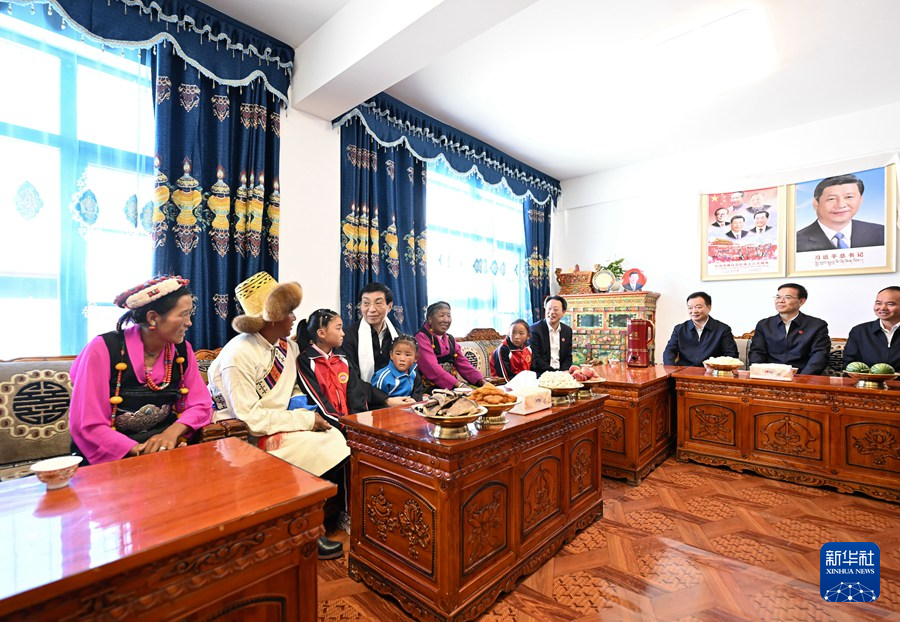 8月22日,受习近平总书记嘱托,带着党中央的亲切关怀和全国人民的深情祝福,中央代表团部分成员在日喀则看望慰问各族干部群众。这是王沪宁和中央代表团部分成员来到定日县长所乡森嘎村考察地震灾后恢复重建和受灾群众搬迁入住情况,看望受灾群众。新华社记者 李响 摄