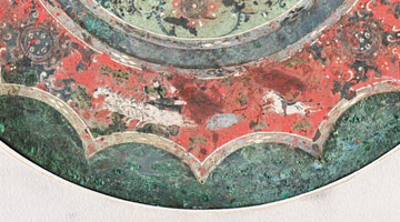铜镜上共绘制17个人物图案,其间穿插绘制树木、草地、野兽等形象,使得四幅画面具有连贯的故事性。难能可贵的是,画面形象均以彩绘形式保留下来,非常罕见。这得益于古代画匠采用了不易氧化的矿物质颜料,朱红、石青、石绿配以黑、白等色彩的调和,使得整体画面显现出丰富多彩又不失协调的效果。