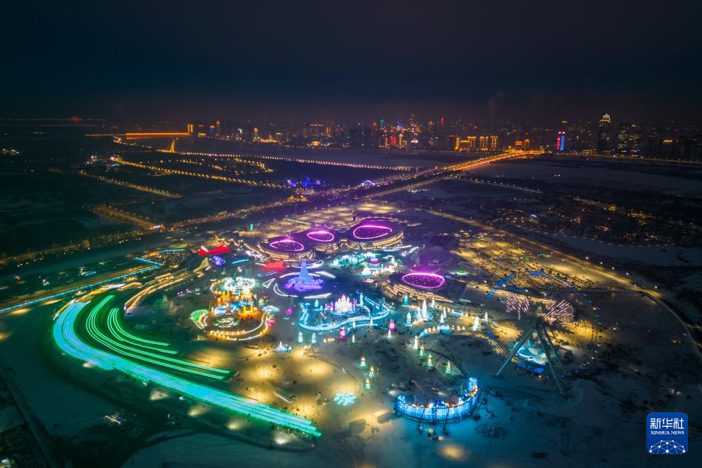 12月14日,工人在哈尔滨冰雪大世界园区建设现场施工(无人机照片)。