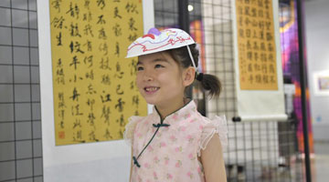 6月10日,小朋友在郑州商代都城遗址博物院里观看苏州园林美学展上展出的苏绣。