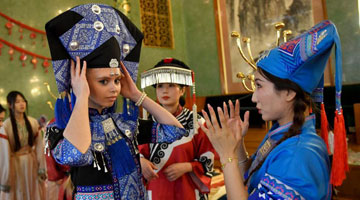 4月15日,在云冈石窟,身着传统服装的演员和游客互动。