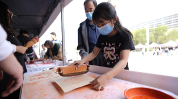 4月16日,游客在山西大同云冈石窟文创空间选购文创产品。