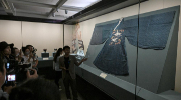这是展出的黄花梨攒靠背禅椅与陶瓷作品《鱼篮观音》(5月19日摄)。