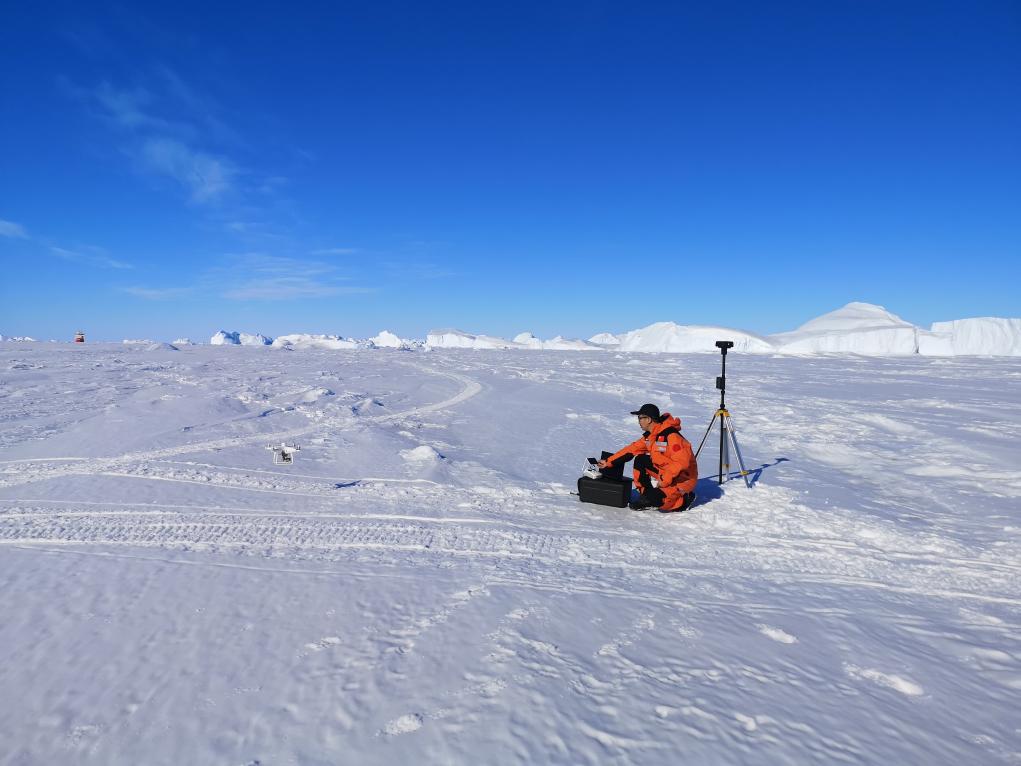 图为乔刚在南极中山站附近海冰冰面开展无人机作业。(受访者供图)