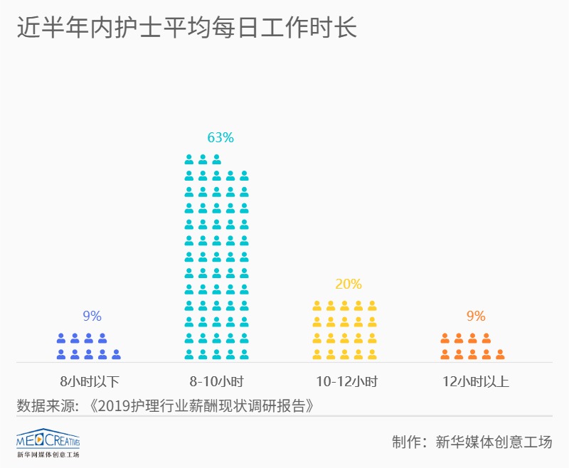 2019年8月,醫學界傳媒發布《2019護理行業薪酬現狀調研報告》,報告顯示91%的護士每日工作8小時以上,近三成護士每日工作超過10小時,其中超過12小時占比9%,大部分護士每日工作時間在8—10小時。