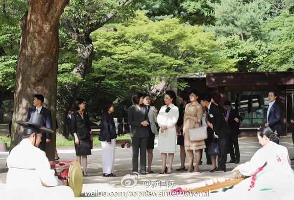 ???? 新華網(wǎng)北京7月3日電? 據(jù)新華社“新國際”微博報(bào)道,習(xí)近平主席夫人彭麗媛3日下午在韓國官員陪同下參觀被列為世界文化遺產(chǎn)的昌德宮,了解宮殿建筑歷史、音樂傳承等情況,并欣賞韓國傳統(tǒng)樂器伽倻琴散調(diào)表演,對(duì)藝術(shù)家的精彩演出表示高度贊賞。彭麗媛說,中韓友誼源遠(yuǎn)流長(zhǎng),歡迎韓國朋友多到中國參觀訪問。