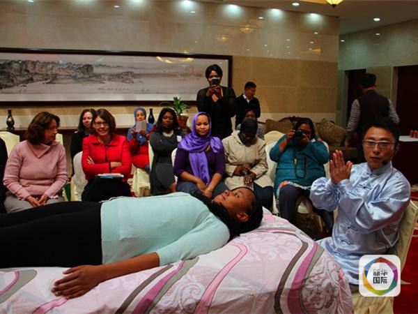 圖為中國(guó)援納米比亞醫(yī)療隊(duì)成員王鵬(前右)演示按摩手法。(新華社記者吳長(zhǎng)偉攝)
