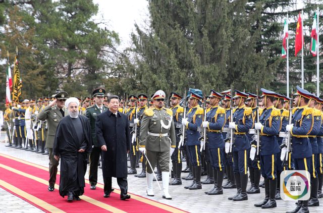 1月23日,國家主席習近平出席伊朗總統魯哈尼在薩德阿巴德王宮共和國樓廣場舉行的隆重歡迎儀式。(新華社記者馬占成攝)