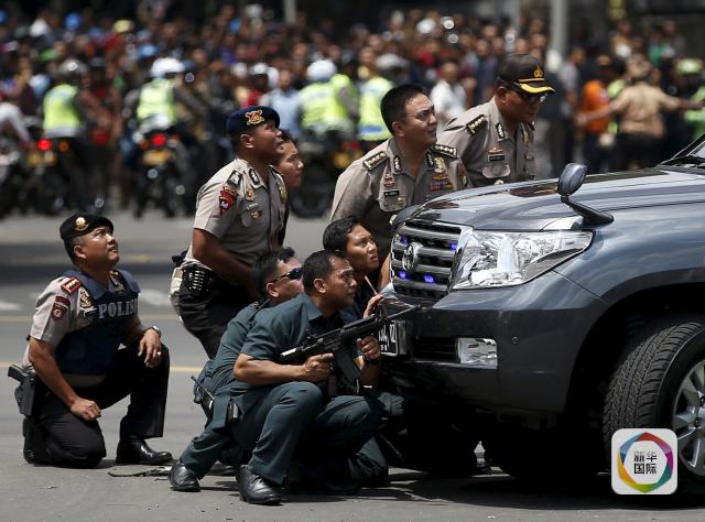1月14日,在印度尼西亞首都雅加達,警察持槍隱蔽在一輛汽車后。雅加達市中心14日上午發生多起爆炸,警方同武裝分子發生交火。新華社/路透
