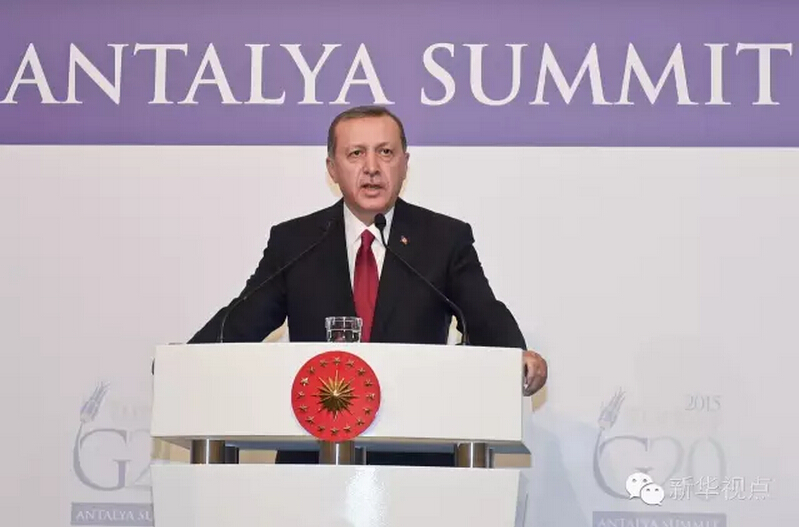 ??? 2015年11月,G20峰會在土耳其安塔利亞舉行,從安塔利亞到杭州,從地中海岸到錢塘江畔,與東道主接力棒一樣順利傳遞的,是對推動全球經(jīng)濟(jì)穩(wěn)步復(fù)蘇、實(shí)現(xiàn)可持續(xù)增長的決心。“接棒”后的中國,在議題設(shè)置上既汲取了安塔利亞峰會的智慧成果,又著眼當(dāng)前、旨在長遠(yuǎn)、彰顯新意。 2015年G20安塔利亞峰會上的埃爾多安總統(tǒng)↓