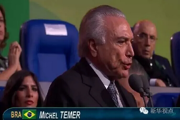 ??? 值得一提的是,出席杭州峰會的特梅爾,奧運(yùn)會時的身份還是代總統(tǒng),當(dāng)?shù)貢r間8月31日,特梅爾正式就任巴西總統(tǒng),杭州峰會成為他就職后出席的首個國際會議。 里約奧運(yùn)會開幕式上的特梅爾↓