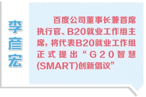 就業(yè)是B20的重點(diǎn)議題之一,也是當(dāng)今世界面臨的重要問題之一。如何創(chuàng)造更加充分、更高質(zhì)量的就業(yè)機(jī)會,推動實(shí)現(xiàn)經(jīng)濟(jì)的持續(xù)和平衡增長,是各國面臨的重要任務(wù)。根據(jù)G20杭州峰會的“創(chuàng)新增長方式”議題,B20就業(yè)工作組主席、百度公司董事長兼首席執(zhí)行官李彥宏代表B20就業(yè)工作組提出了“G20智慧(SMART)創(chuàng)新倡議”。這一倡議得到了二十國集團(tuán)工商界、商協(xié)會、國際機(jī)構(gòu)和智庫代表的廣泛認(rèn)可。