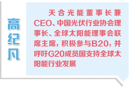 出席B20的全球太陽能理事會聯(lián)席主席、天合光能董事長兼CEO高紀(jì)凡在接受《經(jīng)濟(jì)日報》記者采訪時表示,太陽能發(fā)電已成為全球最便宜的電力資源之一,建議二十國集團(tuán)(G20)支持全球太陽能理事會“至2030年在太陽能行業(yè)創(chuàng)造1000萬個就業(yè)機(jī)會”的目標(biāo),建立太陽能領(lǐng)域的國家級、公私合作的數(shù)據(jù)收集和傳播網(wǎng)絡(luò)。
