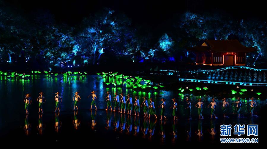 9月4日,演員在表演《采茶舞曲》。當日,出席二十國集團領導人杭州峰會的G20成員和嘉賓國領導人及有關國際組織負責人在杭州西湖景區觀看《最憶是杭州》實景演出交響音樂會。新華社記者 張鐸 攝