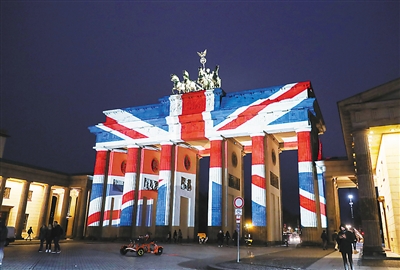3月23日,在德國(guó)首都柏林,英國(guó)國(guó)旗樣式的彩燈點(diǎn)亮勃蘭登堡門(mén),悼念英國(guó)倫敦恐怖襲擊事件中的遇難者。 新華社記者 單宇琦攝
