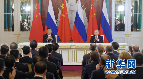 7月4日,國家主席習(xí)近平在莫斯科克里姆林宮同俄羅斯總統(tǒng)普京舉行會談。會談后,兩國元首簽署了《中華人民共和國和俄羅斯聯(lián)邦關(guān)于進(jìn)一步深化全面戰(zhàn)略協(xié)作伙伴關(guān)系的聯(lián)合聲明》《中華人民共和國和俄羅斯聯(lián)邦關(guān)于當(dāng)前世界形勢和重大國際問題的聯(lián)合聲明》,批準(zhǔn)了《〈中華人民共和國和俄羅斯聯(lián)邦睦鄰友好合作條約〉實(shí)施綱要(2017年至2020年)》并見證了《中華人民共和國外交部和俄羅斯聯(lián)邦外交部關(guān)于朝鮮半島問題的聯(lián)合聲明》以及經(jīng)貿(mào)、農(nóng)業(yè)、能源、基礎(chǔ)設(shè)施建設(shè)、金融、文化、創(chuàng)新、媒體、信息網(wǎng)絡(luò)、檢驗(yàn)檢疫等領(lǐng)域多項(xiàng)雙邊合作文件的交換。新華社記者 謝環(huán)馳 攝