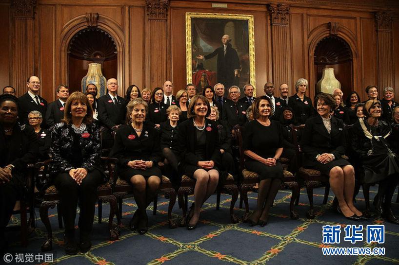 當地時間1月30日,美國華盛頓,民主黨國會議員和性侵幸存者一同穿黑衣現身國會大廈,聲援勇敢反對性騷擾和歧視的人們。眾議院民主黨人計劃穿黑衣出席特朗普的國情咨文演講,支持MeToo和TimesUp組織。 (圖片來源:視覺中國)