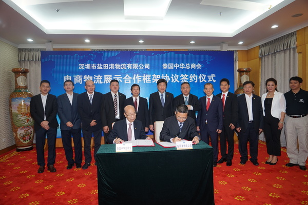 泰國中華總商會主席陳振治一行與深圳市鹽田港物流有限公司簽署電商物流展示合作框架協議。圖中前排為陳振治(左)和劉南安(右)。主辦方供圖。