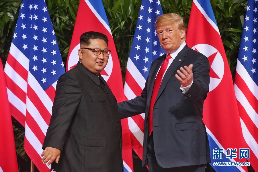6月12日,朝鮮最高領導人金正恩(左)與美國總統(tǒng)特朗普在新加坡舉行會晤。 新華社發(fā)(新加坡海峽時報供圖)