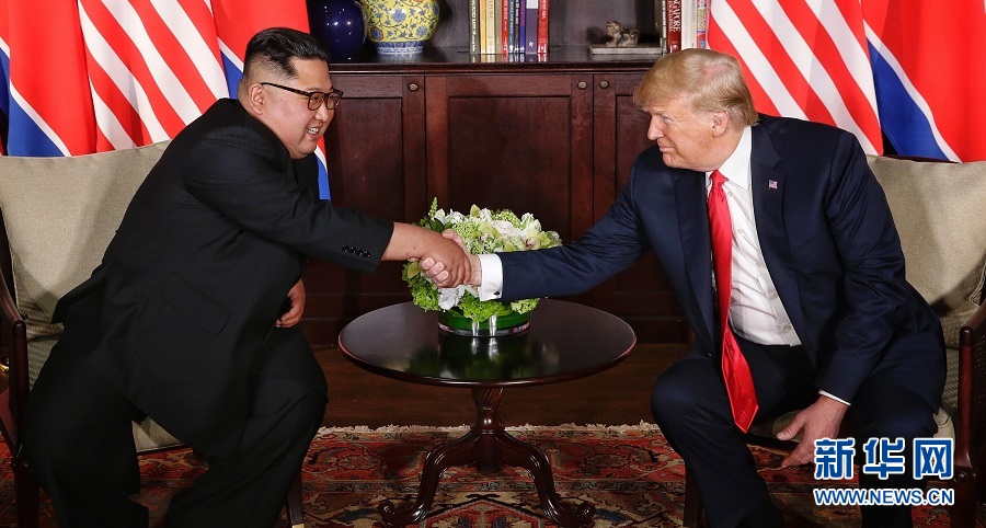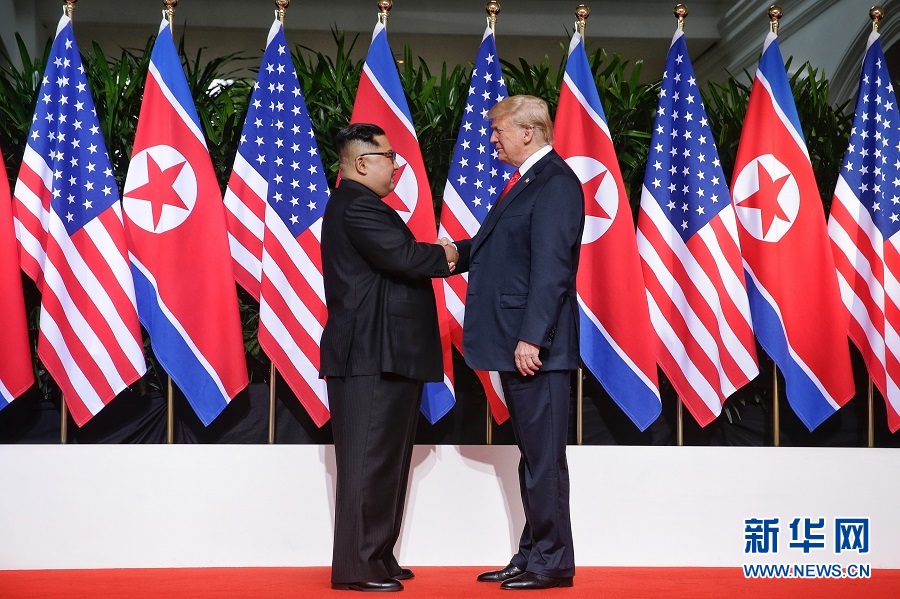 6月12日,朝鮮最高領導人金正恩(左)與美國總統特朗普在新加坡舉行會晤。 新華社發(新加坡通訊及新聞部供圖)