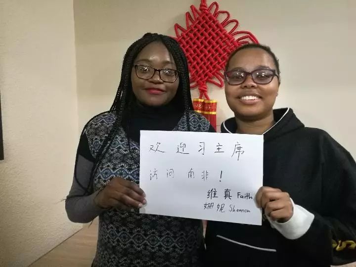 “雖然中文學起來很有挑戰性,但這也恰恰是吸引我的原因?!眾櫮莺屯榫S真向記者驕傲地展示她們書寫的漢字:歡迎習主席訪問南非!