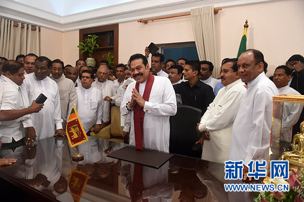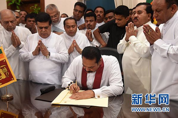 10月29日,在斯里蘭卡科倫坡,拉賈帕克薩(中)在總理辦公室舉行履新儀式。 新華社發(哈普拉徹奇 攝)