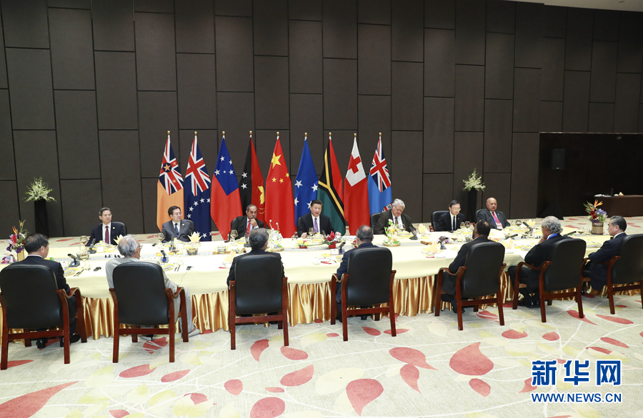 11月16日,國家主席習(xí)近平在莫爾茲比港同巴布亞新幾內(nèi)亞總理奧尼爾、密克羅尼西亞聯(lián)邦總統(tǒng)克里斯琴、薩摩亞總理圖伊拉埃帕、瓦努阿圖總理薩爾瓦伊、庫克群島總理普納、湯加首相波希瓦、紐??偫硭冉ń惶窖髰u國領(lǐng)導(dǎo)人以及斐濟(jì)政府代表、國防部長昆布安博拉舉行集體會晤。習(xí)近平主持會晤并發(fā)表主旨講話。 新華社記者 龐興雷 攝