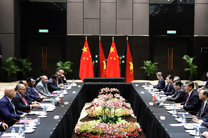 11月16日,國家主席習(xí)近平在莫爾茲比港分別會(huì)見建交太平洋島國領(lǐng)導(dǎo)人。這是習(xí)近平會(huì)見密克羅尼西亞聯(lián)邦總統(tǒng)克里斯琴。新華社記者 謝環(huán)馳 攝
