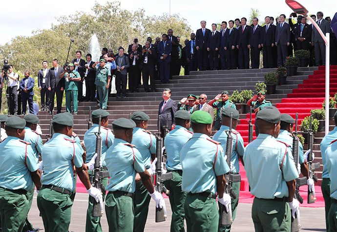 11月16日,國家主席習(xí)近平在莫爾茲比港會(huì)見巴布亞新幾內(nèi)亞總督達(dá)達(dá)埃。會(huì)見開始前,達(dá)達(dá)埃在議會(huì)大廈前廣場(chǎng)為習(xí)近平舉行隆重歡迎儀式。新華社記者 鞠鵬 攝