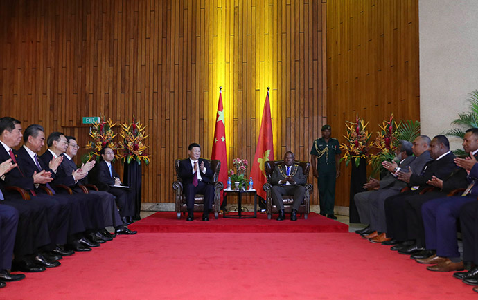 11月16日,國家主席習(xí)近平在莫爾茲比港同巴布亞新幾內(nèi)亞總理奧尼爾、密克羅尼西亞聯(lián)邦總統(tǒng)克里斯琴、薩摩亞總理圖伊拉埃帕、瓦努阿圖總理薩爾瓦伊、庫克群島總理普納、湯加首相波希瓦、紐??偫硭冉ń惶窖髰u國領(lǐng)導(dǎo)人以及斐濟(jì)政府代表、國防部長(zhǎng)昆布安博拉舉行集體會(huì)晤。習(xí)近平主持會(huì)晤并發(fā)表主旨講話。新華社記者 謝環(huán)馳 攝