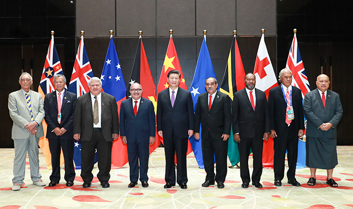 11月16日,國家主席習(xí)近平在莫爾茲比港同巴布亞新幾內(nèi)亞總理奧尼爾、密克羅尼西亞聯(lián)邦總統(tǒng)克里斯琴、薩摩亞總理圖伊拉埃帕、瓦努阿圖總理薩爾瓦伊、庫克群島總理普納、湯加首相波希瓦、紐埃總理塔拉吉等建交太平洋島國領(lǐng)導(dǎo)人以及斐濟(jì)政府代表、國防部長(zhǎng)昆布安博拉舉行集體會(huì)晤。習(xí)近平主持會(huì)晤并發(fā)表主旨講話。新華社記者 龐興雷 攝