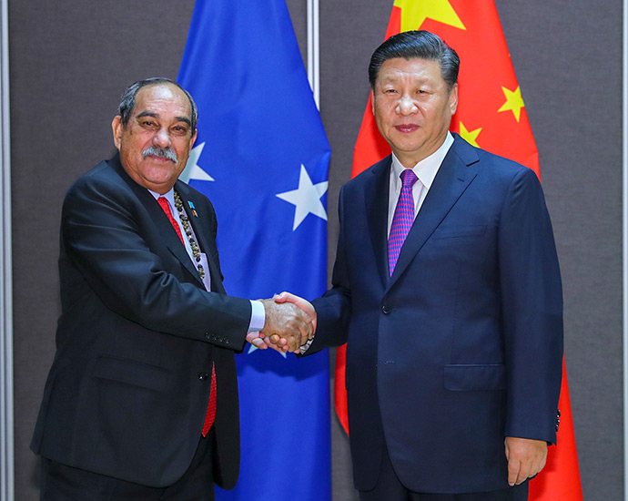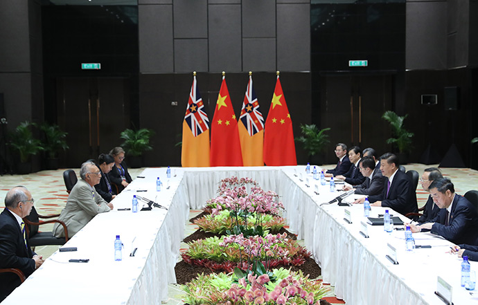 11月16日,國家主席習(xí)近平在莫爾茲比港分別會(huì)見建交太平洋島國領(lǐng)導(dǎo)人。這是習(xí)近平會(huì)見紐埃總理塔拉吉。新華社記者 丁林 攝