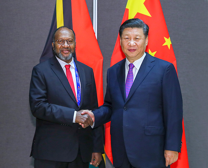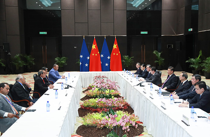 11月16日,國家主席習(xí)近平在莫爾茲比港分別會(huì)見建交太平洋島國領(lǐng)導(dǎo)人。這是習(xí)近平會(huì)見密克羅尼西亞聯(lián)邦總統(tǒng)克里斯琴。新華社記者 龐興雷 攝