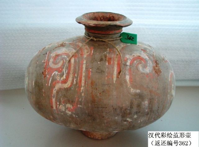 這是漢代彩繪繭形壺(返還編號362),圖案為對稱幾何紋。