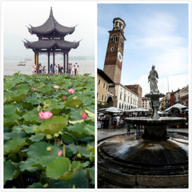 這是一張拼版照片,左為杭州,右為維羅納。新華社發