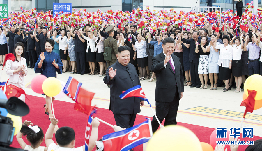 6月21日,中共中央總書記、國(guó)家主席習(xí)近平結(jié)束對(duì)朝鮮的國(guó)事訪問(wèn)離開平壤回國(guó)。離開前,習(xí)近平和夫人彭麗媛出席朝鮮勞動(dòng)黨委員長(zhǎng)、國(guó)務(wù)委員會(huì)委員長(zhǎng)金正恩和夫人李雪主在機(jī)場(chǎng)舉行的歡送儀式。新華社記者 黃敬文 攝