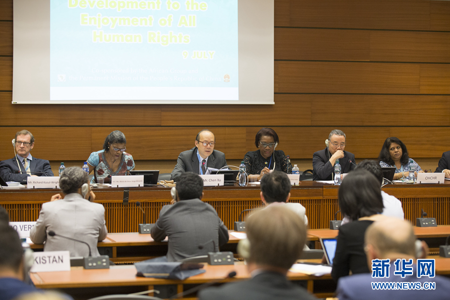 7月9日,在瑞士日內(nèi)瓦聯(lián)合國(guó)萬(wàn)國(guó)宮,與會(huì)嘉賓出席“發(fā)展對(duì)享有所有人權(quán)的貢獻(xiàn)”主題邊會(huì)。新華社記者 徐金泉 攝