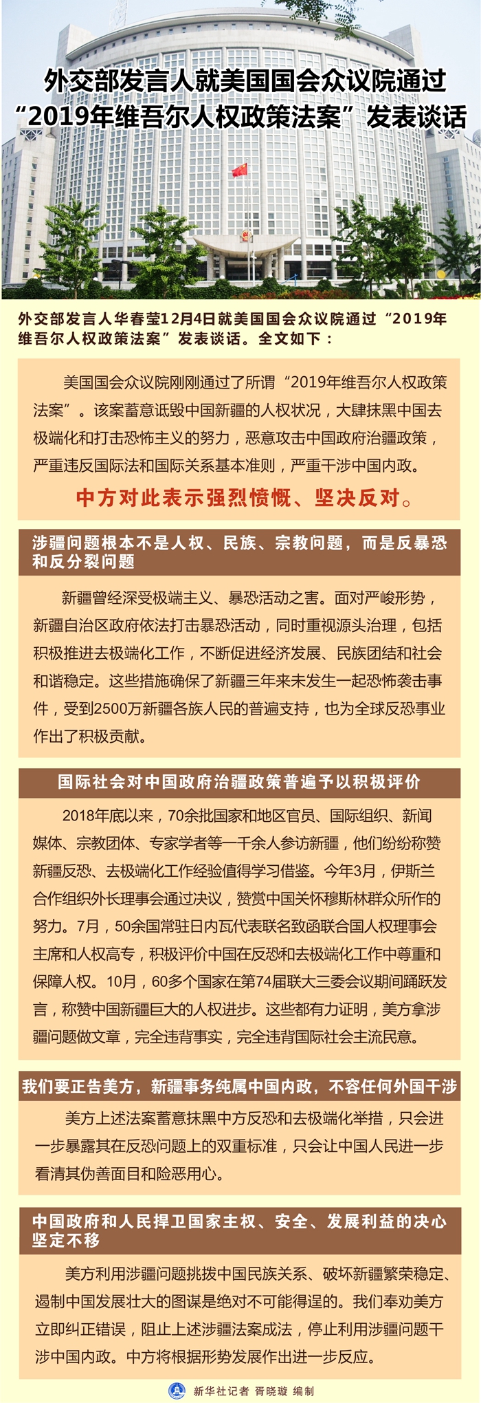 新華社北京12月4日電 外交部發言人華春瑩4日就美國國會眾議院通過“2019年維吾爾人權政策法案”發表談話。全文如下: