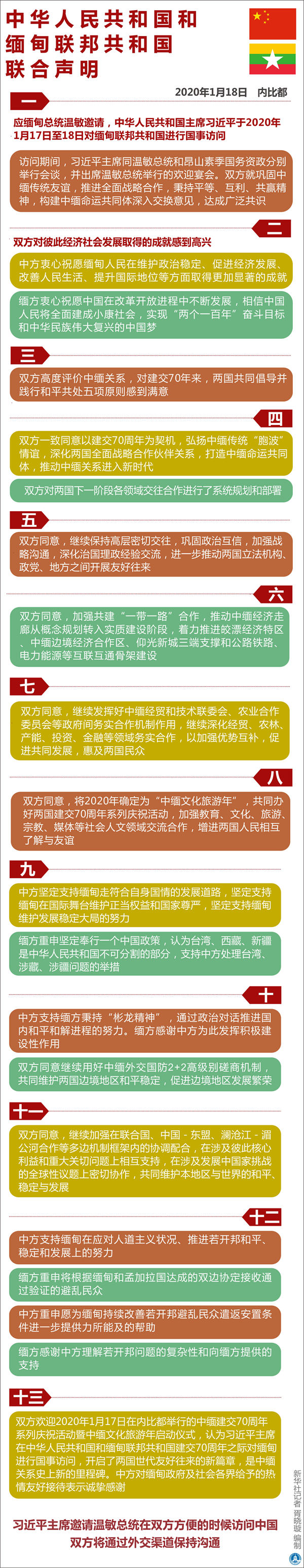 十三、雙方歡迎2020年1月17日在內(nèi)比都舉行的中緬建交70周年系列慶祝活動暨中緬文化旅游年啟動儀式,認為習(xí)近平主席在中華人民共和國和緬甸聯(lián)邦共和國建交70周年之際對緬甸進行國事訪問,開啟了兩國世代友好往來的新篇章,是中緬關(guān)系史上新的里程碑。中方對緬甸政府及社會各界給予的熱情友好接待表示誠摯感謝。