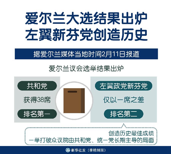 新華社都柏林2月11日電(記者張琪)據愛爾蘭媒體11日報道,愛爾蘭議會選舉結果出爐:共和黨獲得38席,排名第一;左翼政黨新芬黨僅以一席之差排名第二,創造歷史最佳成績,一舉打破眾議院由共和黨、統一黨長期主導的局面。