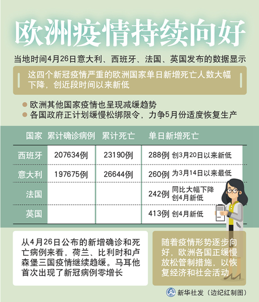 新華社里斯本4月26日電 綜合新華社駐歐洲地區記者報道:意大利、西班牙、法國、英國26日發布的數據顯示,這四個新冠疫情嚴重的歐洲國家單日新增死亡人數大幅下降,創近段時間以來新低。歐洲其他國家疫情也呈現減緩趨勢。各國政府正計劃緩慢松綁限令,力爭5月份適度恢復生產。