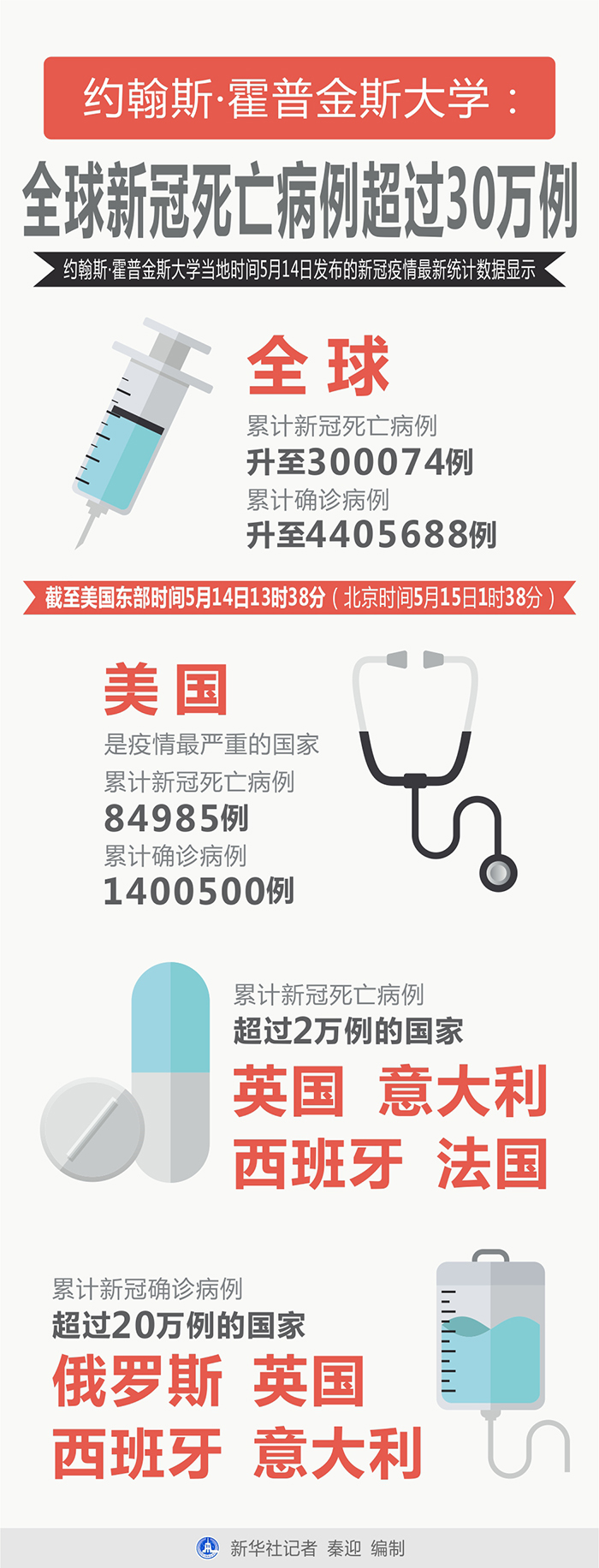 新華社北京5月15日電 ?14日全球疫情簡報:美研究機構(gòu)統(tǒng)計美國新冠確診超140萬 全球病亡超30萬