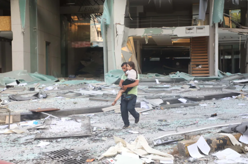 8月4日,在黎巴嫩首都貝魯特,一名男子抱著孩子走過嚴重受損的建筑。新華社發(比拉爾·賈維希攝)