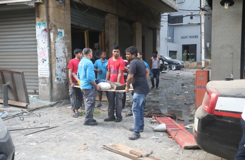 8月4日,在黎巴嫩首都貝魯特,民眾運送爆炸傷員。新華社發(比拉爾·賈維希攝)