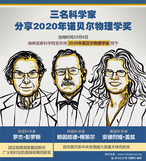 新華社斯德哥爾摩10月6日電(記者和苗 付一鳴)瑞典皇家科學院6日宣布,將2020年諾貝爾物理學獎授予三名科學家。英國科學家羅杰·彭羅斯因證明黑洞是愛因斯坦廣義相對論的直接結果而獲獎;德國科學家賴因哈德·根策爾和美國科學家安德烈婭·蓋茲因在銀河系中央發現超大質量天體而獲獎。