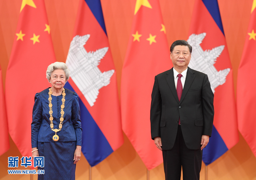 11月6日,國家主席習近平在北京人民大會堂為柬埔寨太后莫尼列舉行中華人民共和國“友誼勛章”頒授儀式。 新華社記者 張領 攝