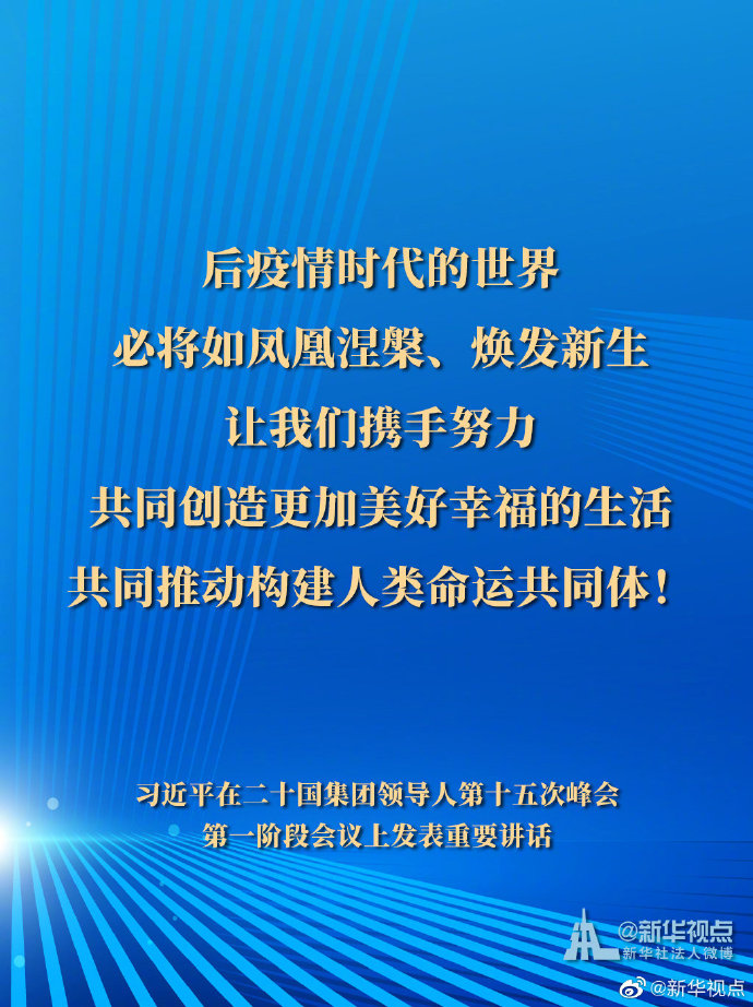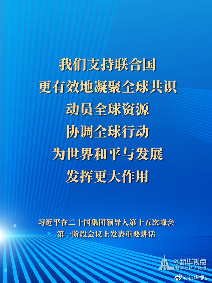 11月21日,國(guó)家主席習(xí)近平在二十國(guó)集團(tuán)領(lǐng)導(dǎo)人第十五次峰會(huì)第一階段會(huì)議上發(fā)表重要講話。一起來看習(xí)主席的G20金句。